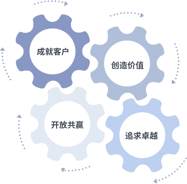 成就客户是一切决策的出发点,,,创造价值是衡量所有工作的标准,,追求卓越是我们做事做人的态度,,,开放共赢是我们的格局也是最终的结果。。价值观的齿轮环环相扣,,推动着组织里的每个人不断向前。。。。
